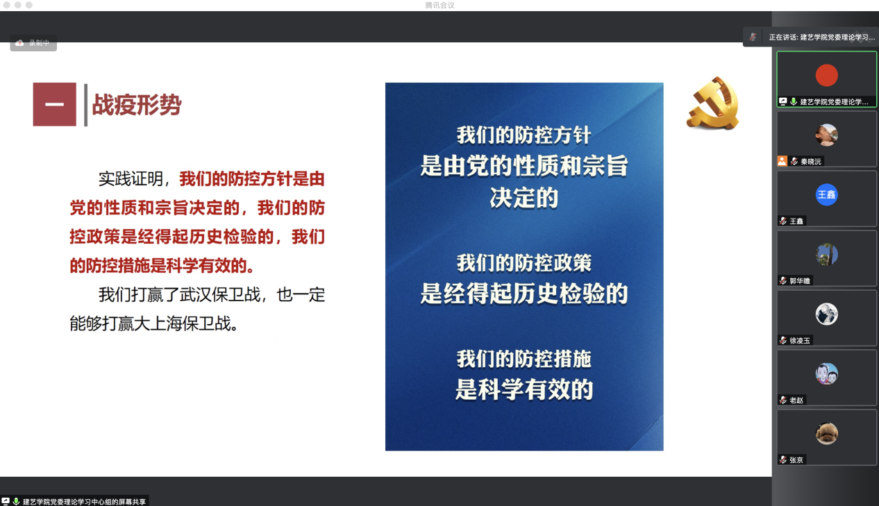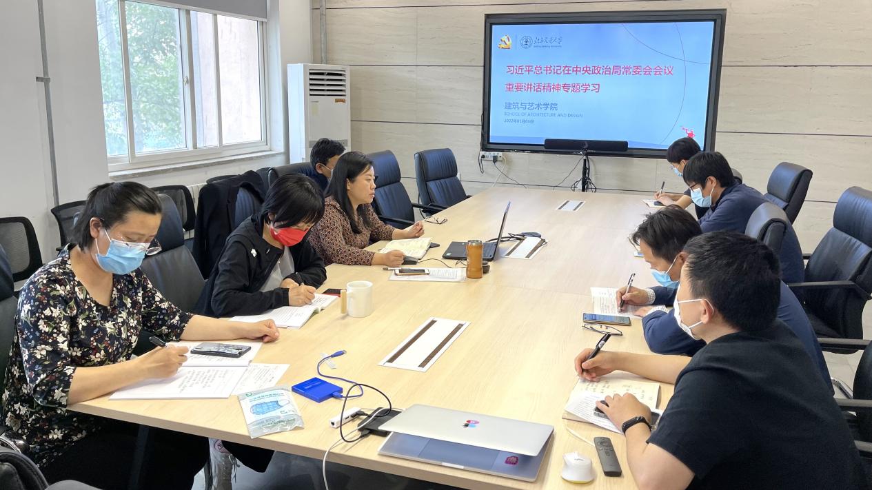 2022年5月6日,建艺学院党委专题学习习近平总书记在中央政治局常委会会议重要讲话精神,会议由学院党委书记秦思阳主持,学院党委委员、学生工作人员现场参会,各教师党支部书记线上参加会议。