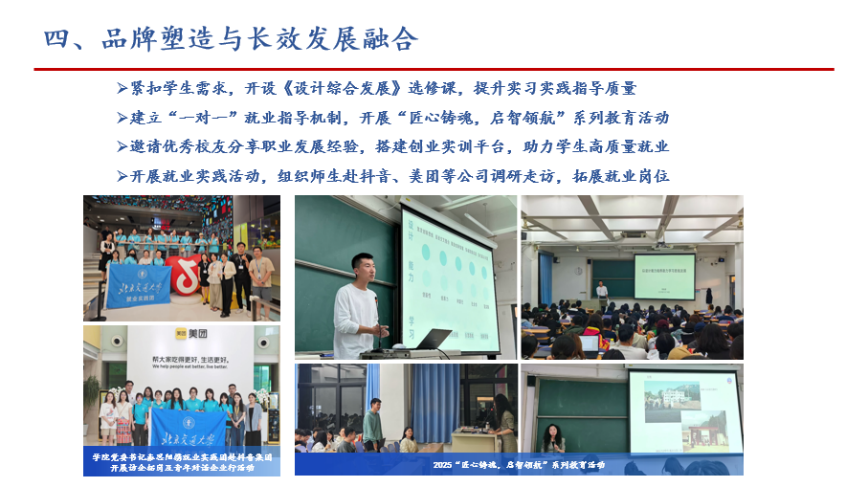 机关党支部紧扣学生成长需求,开设《设计综合发展》选修课,强化实习实践指导。支部建立“一对一”就业指导机制,开展“匠心铸魂,启智领航”系列教育活动,搭建创业实训平台,助力学生高质量就业,形成可持续育人模式。