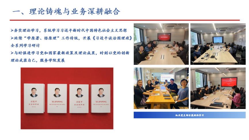 机关党支部现有9名党员,在学院党委坚强领导下,以学习贯彻习近平新时代中国特色社会主义思想为主线,形成“四维融合”工作法,以“理论筑基、管理赋能、科研聚力、品牌引领”四维融合,服务学院工作高质量发展,主要做法如下: