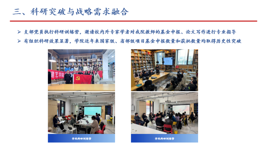 支部党员连续六年执行科研训练营,邀请校内外专家学者对小鸭看看 教师的基金申报、论文写作进行专业指导,有组织科研效果显著,学院近年来国家级、省部级项目基金申报数量和获批数量均取得历史性突破。