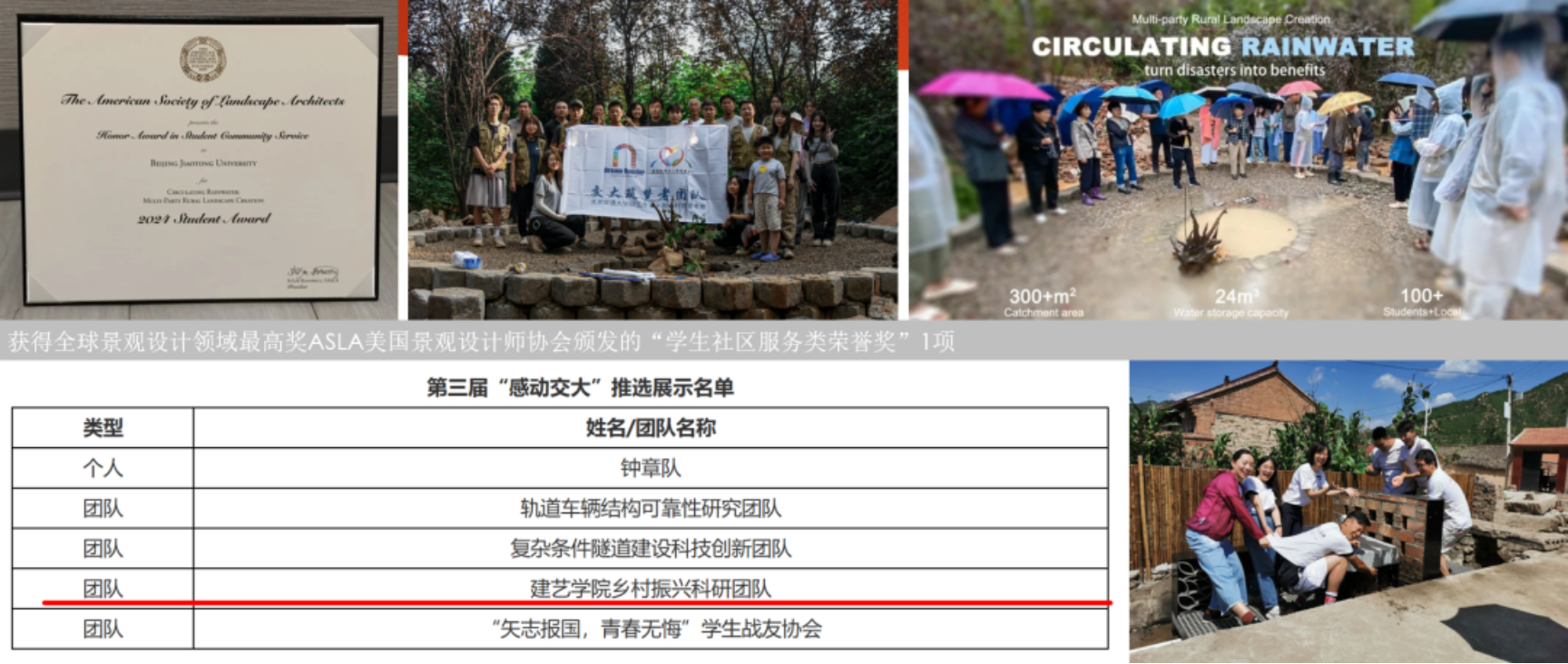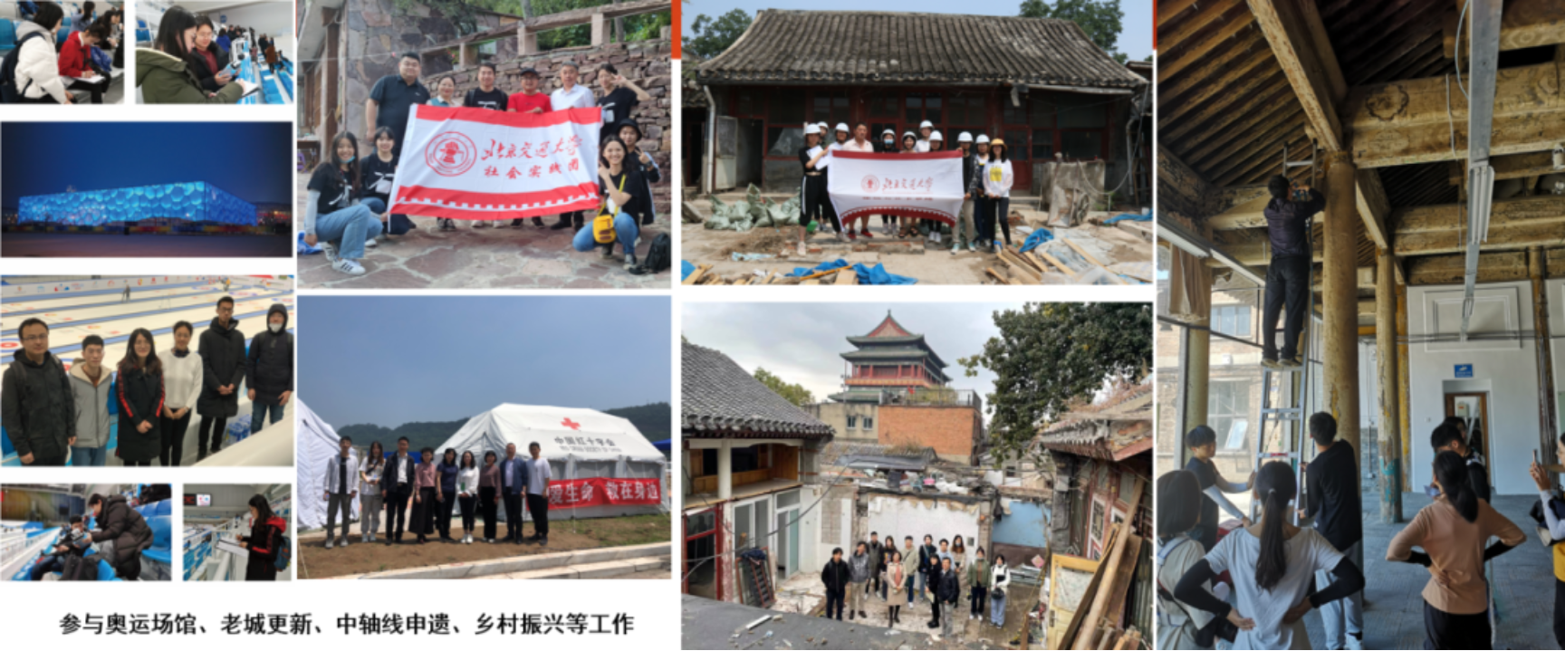支部党员参与冬奥场馆“冰立方”室内物理环境测试;参与北京老城钟鼓楼片区、故宫周边片区、西草市片区近50个院落的改造方案,为中轴线成功申遗做出了贡献;为山西、北京、辽宁等多个省份的传统村落争取到国家资金超过2亿元,为河南等多地乡村提供方案支持,乡村振兴团队成为学院“感动交大”团队的核心力量;为应急救灾而设计,作品已纳入四川省红十字会备灾库;为交大而设计,南门、百年纪念亭、雄安新校区,都凝聚着我们爱国荣校的真挚情怀。