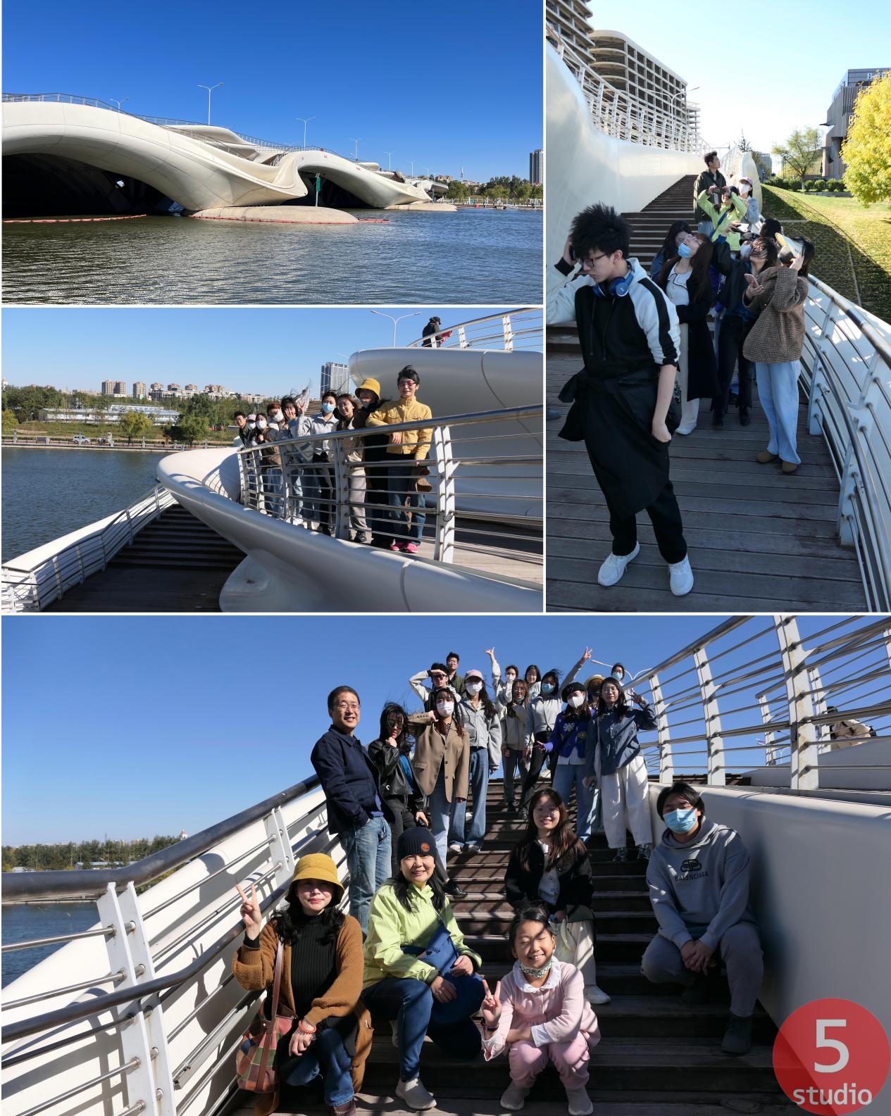 第五工作室团队早上八点半从学院门口集合乘坐大巴出发,沿线分别参观了新潞·运河文创园、千荷泻露桥及周边、城市绿心公园。