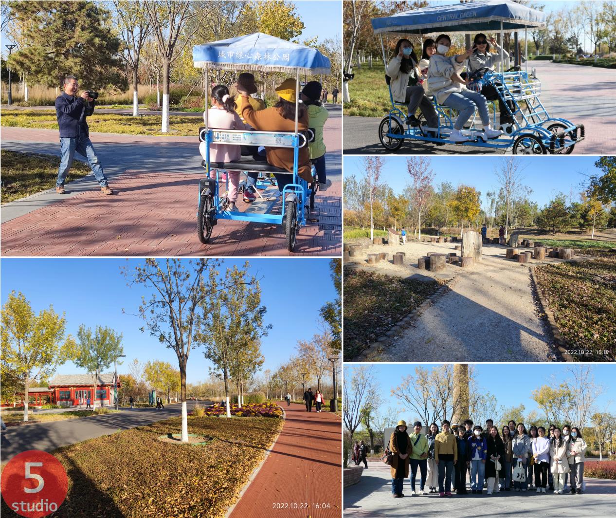 第五工作室集体出行,由李旭佳、魏泽崧、蒙小英、薛彦波4位老师带领,汇集了工作室的本科生和研究生共17名同学,赴通州市沿线园区及公园进行参观调研。