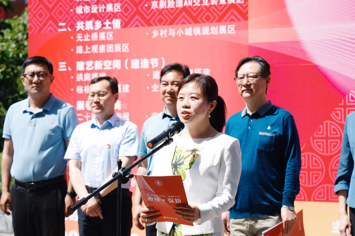 建筑系副教授程力真代表指导教师发言,她深情回顾了十几年来建造节的发展历程,这个发展变化正是建艺学院在全校美育教育建设、思政教育建设和立德树人方面作出的努力与成果。