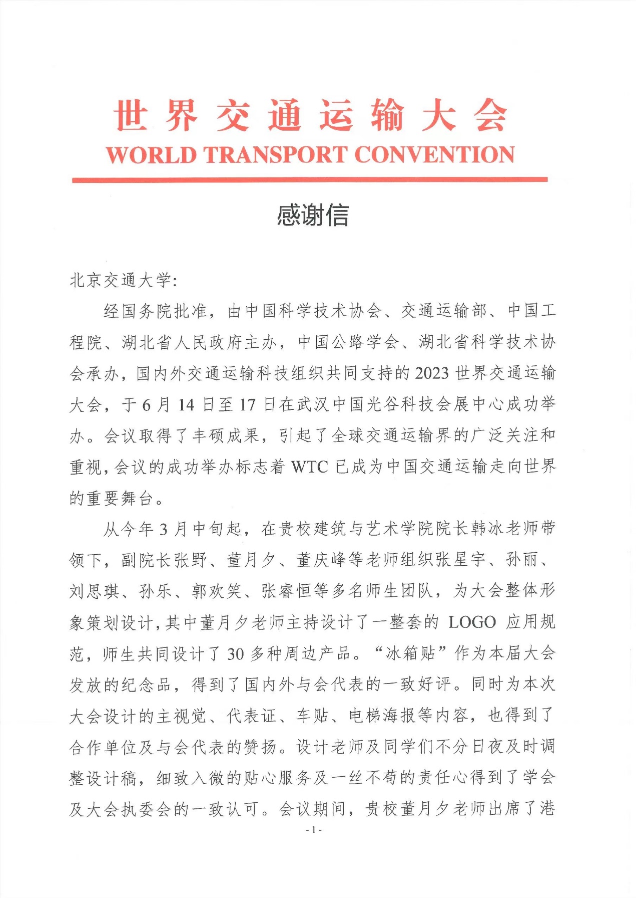 世界交通运输大会执委会在感谢信中提到,今年3月中旬开始,在建艺学院院长韩冰带领下,副院长张野、董月夕、董庆峰等老师组织多名师生团队,为大会整体形象策划设计,其中董月夕老师主持设计了一整套的LOGO应用规范,师生共同设计了30多种周边产品,为本次大会设计的主视觉、纪念品、代表证、车贴、电梯海报等内容,得到了国内外与会代表的一致好评,展现出学院师生极高的专业素养和责任心。
