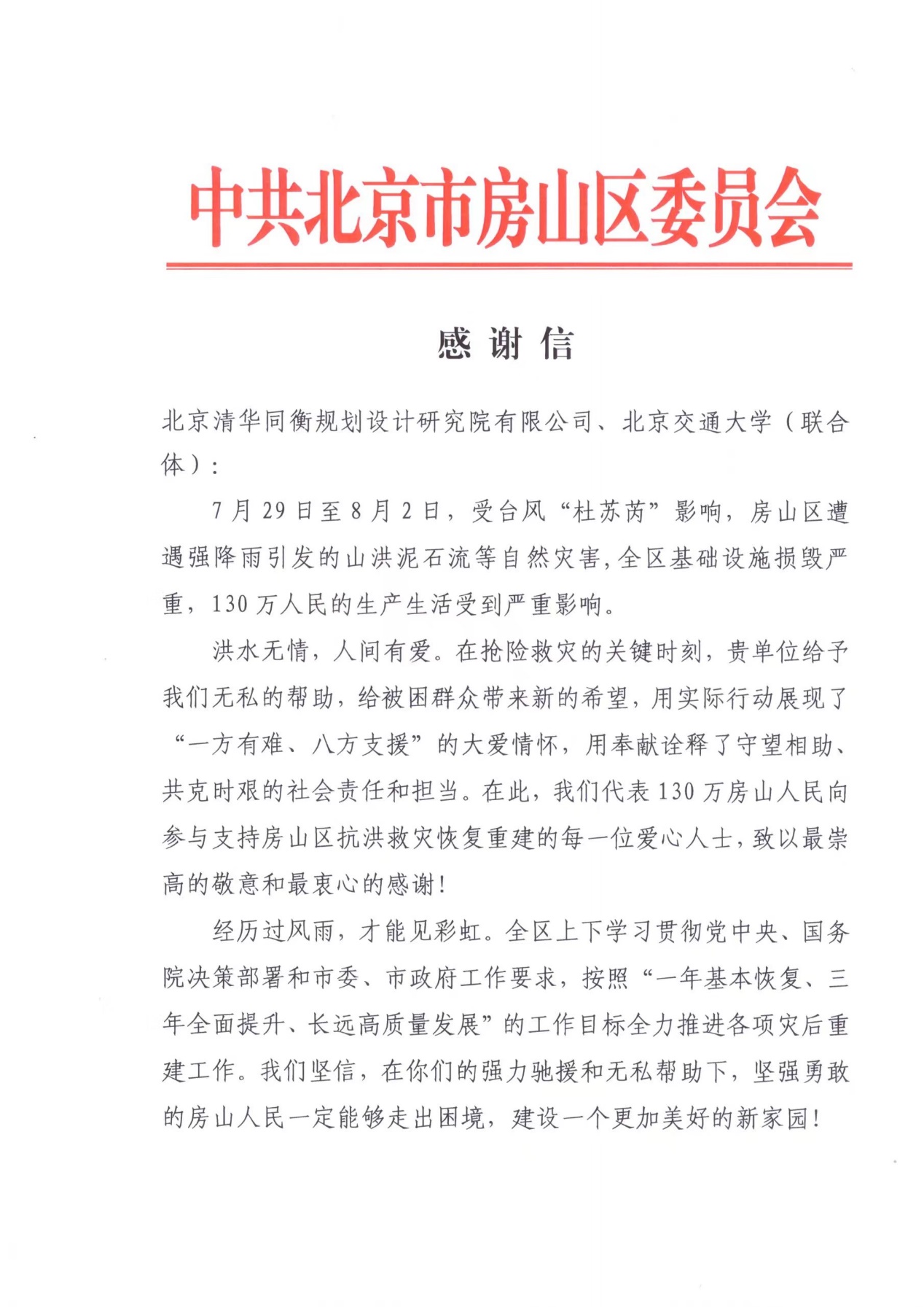 北京市房山区委区政府在感谢信中提到,7月29日至8月2日,房山区遭遇强降雨引发的山洪泥石流等自然灾害,在抢险救灾的关键时刻,我校给予房山区无私的帮助,用实际行动展现了大爱情怀,用奉献诠释了高校的社会责任和担当。房山区灾后重建工作由建艺学院副院长佘高红,城乡规划系主任王鑫,副主任张纯,朱高儒、徐凌玉、徐高峰、张威涛等多位教师组建师生团队参与。