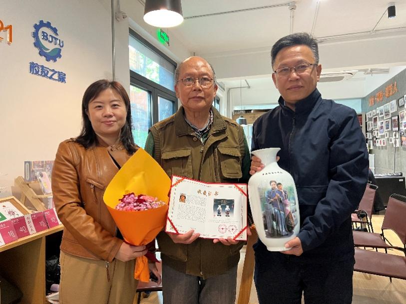 秦思阳、韩冰为老教师赠与鲜花和学院的文创产品。