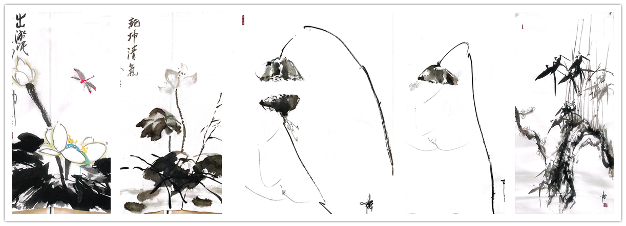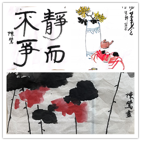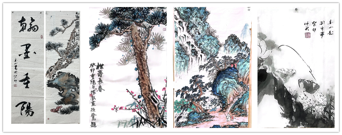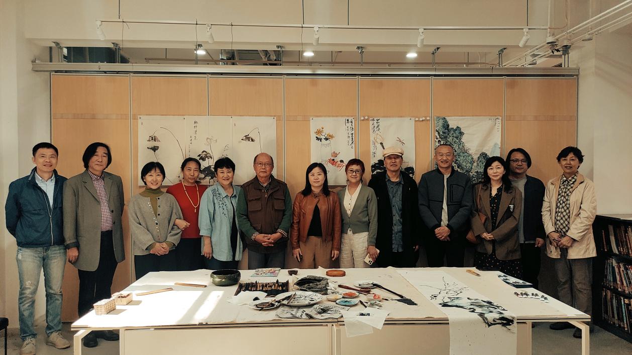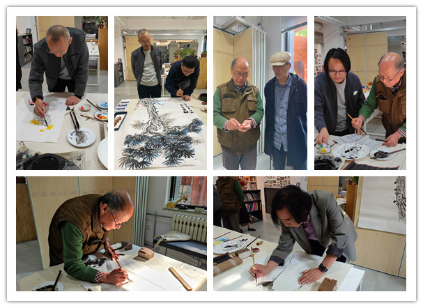 座谈会后,学院老师们一同前往学院资料室进行艺术创作。活动现场,老中青齐聚一堂,诗书画融为一体,在职教师张澎、陈鹭、董庆峰与老教师一同在宣纸上悬腕提肘、挥毫泼墨,以飘逸洒脱、行云流水的手法,饱含深情的笔触,合作创作出《松寿长春》《静而不争》《乾坤清气》《淡怡如笑》等一幅幅或刚劲有力、或恬淡悠远的书画作品。纸墨飘香,艺术传情,现场的老师们纷纷被作品的精神内涵与传统文化的魅力所感染,发出了由衷的赞叹。