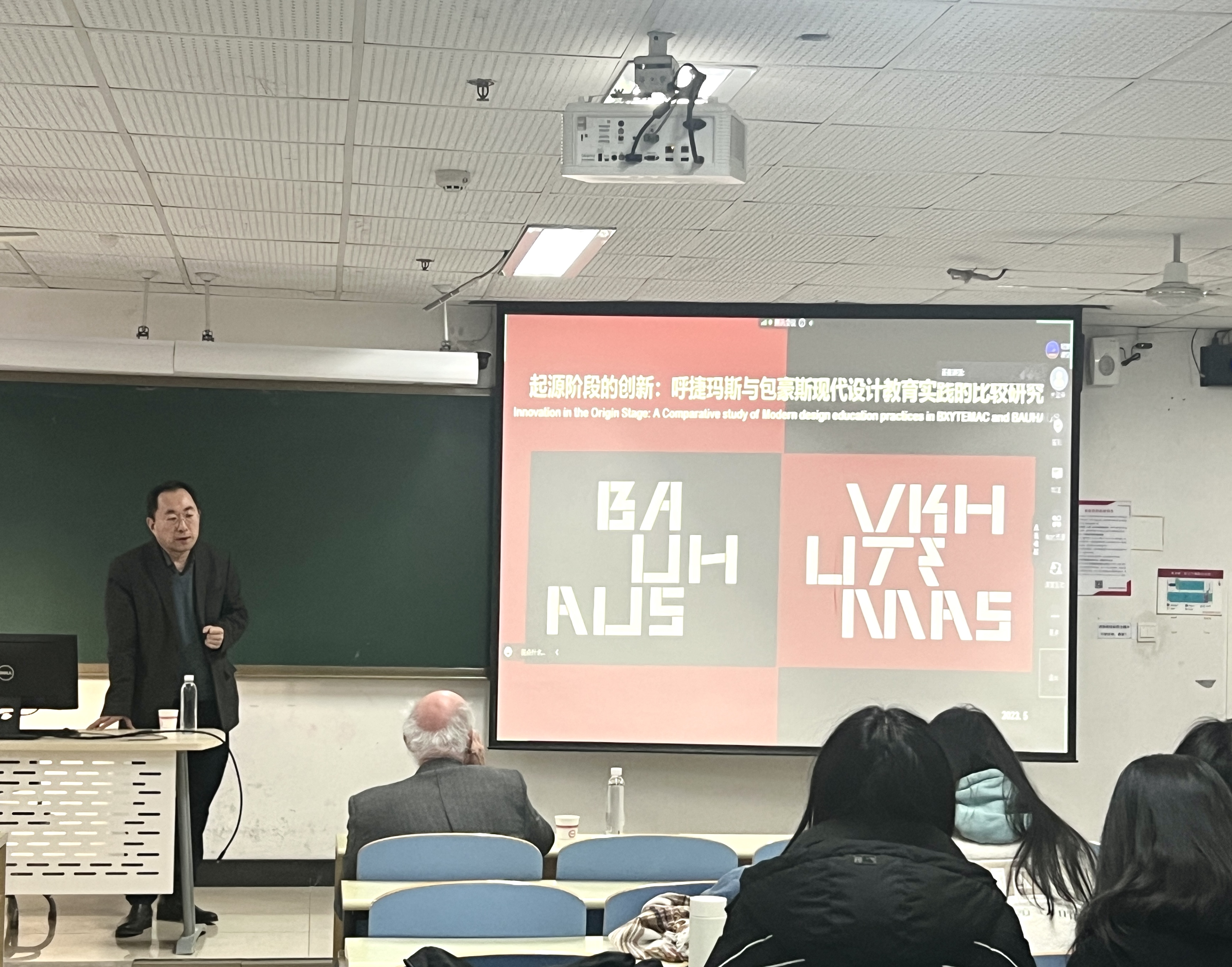 《呼捷玛斯与包豪斯》讲座中,MERIGGI教授介绍了包豪斯和呼捷玛斯两个现代建筑及艺术教育起源地的发展历程与设计变革。主要阐述包豪斯教学及理念,以及在意大利地区的发展与影响,结合设计作品向同学们展现了现代主义建筑启蒙阶段的形态,以及在意大利地区的探索。同时,韩林飞教授侧重介绍了百年呼捷玛斯的发展历程与教学思想,并结合两所学校的课程体系、学生作品等阐述在特定的时代背景下,现代建筑及艺术如何在学校教育中启蒙与发展。MERIGGI教授与韩林飞教授共同为同学们带来一场学术盛宴。讲座结束后,同学们积极提问,MERIGGI教授与同学们进行互动交流,并探讨学生提出的问题。