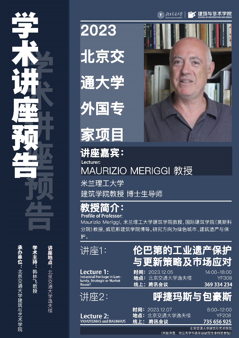 毛里齐奥·梅里吉(Maurizio Meriggi)教授是米兰理工大学建筑、城市规划和建造学院建筑和城市研究系教授,国际建筑学院(莫斯科分院)教授,威尼斯建筑学院博导,长期从事绿色城市,建筑遗产与保护以及苏俄前卫艺术的研究。梅里吉教授作为米兰理工大学的国际事务代表,多次到中国与国内高校进行学术交流和项目合作活动。他曾带领中国学生与广东政府进行广泛的国际项目合作,旨在保护现在属于珠江三角洲大都市的客家村落等;参与欧盟研究项目“Marie Curie Action - PUMAH(规划、城市管理和遗产)”组织国外高校(Newcastle, Groningen, Metu-Ankara, Politecnico di Milano, Italian CNR)与国内高校(北京大学、武汉大学)进行项目合作,对中意两国的建筑学的学术交流与项目合作作出突出贡献。