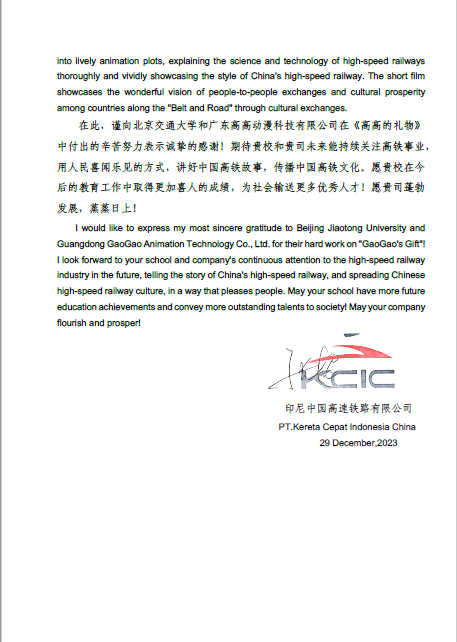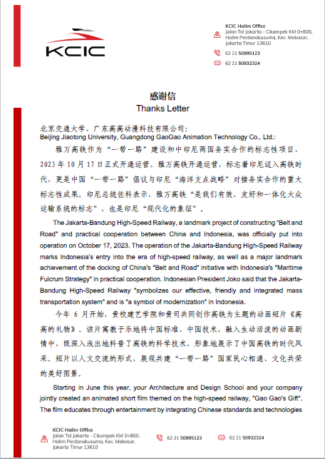 近日,学校收到来自印尼中国高速铁路有限公司的感谢信,对建艺学院与校企合作单位以雅万高铁为主题共同创作的动画片《高高的礼物》给予高度评价和诚挚感谢!